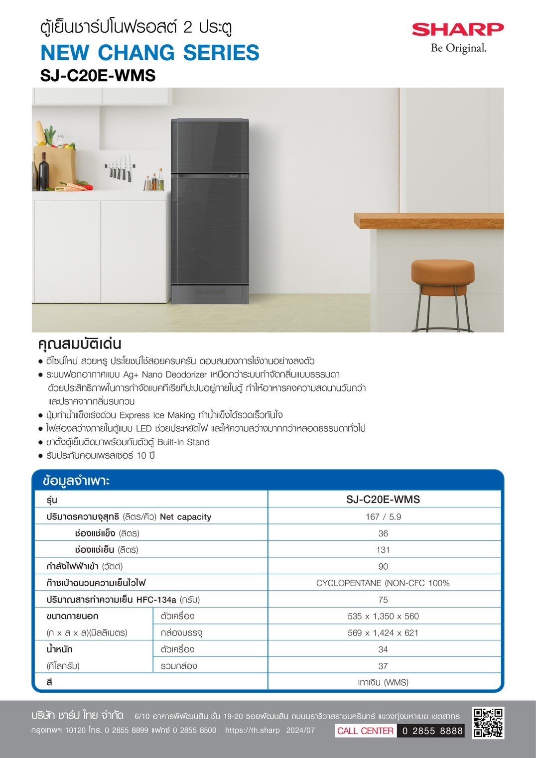 SHARP ตู้เย็น 2 ประตู รุ่น SJ-C20E-WMS 5.9 คิว รุ่นใหม่ 2024