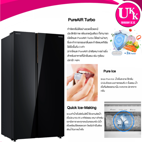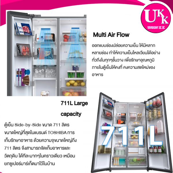 ตู้เย็น Side-by-Side ขนาด 711 ลิตร ขนาดใหญ่ที่สุดในแบรนด์ TOSHIBA การเก็บรักษาอาหาร ด้วยความจุขนาดใหญ่ถึง 711 ลิตร จึงสามารถจัดเก็บอาหารและวัตถุดิบ ได้ทีละมากๆในคราวเดียว เหมือนยกซูเปอร์มาร์เก็ตมาไว้ในบ้าน