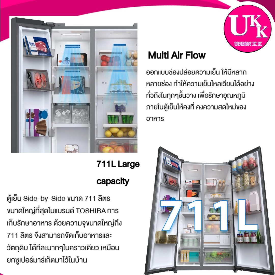 ตู้เย็น Side-by-Side ขนาด 711 ลิตร ขนาดใหญ่ที่สุดในแบรนด์ TOSHIBA การเก็บรักษาอาหาร ด้วยความจุขนาดใหญ่ถึง 711 ลิตร จึงสามารถจัดเก็บอาหารและวัตถุดิบ ได้ทีละมากๆในคราวเดียว เหมือนยกซูเปอร์มาร์เก็ตมาไว้ในบ้าน