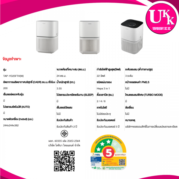 ข้อมูลจำเพาะ รุ่น TAP-YD25FTH(W)