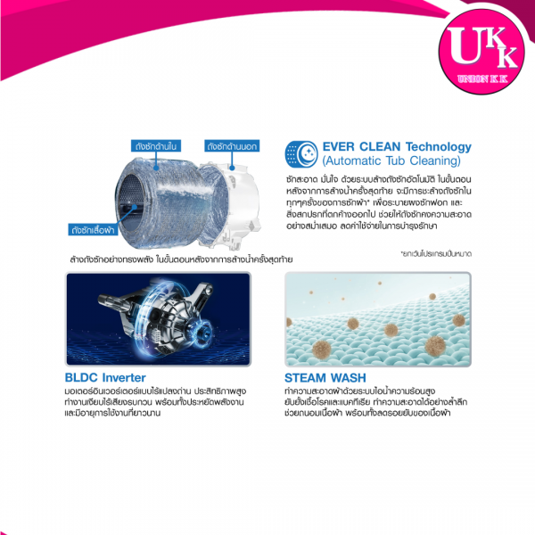 ซักสะอาด มั่นใจด้วยระบบล้างถังซักอัตโนมัติ เทคโนโลยี EVERCLEAN และช่วยลดค่าใช้จ่ายในการดูแลรักษาถังซัก