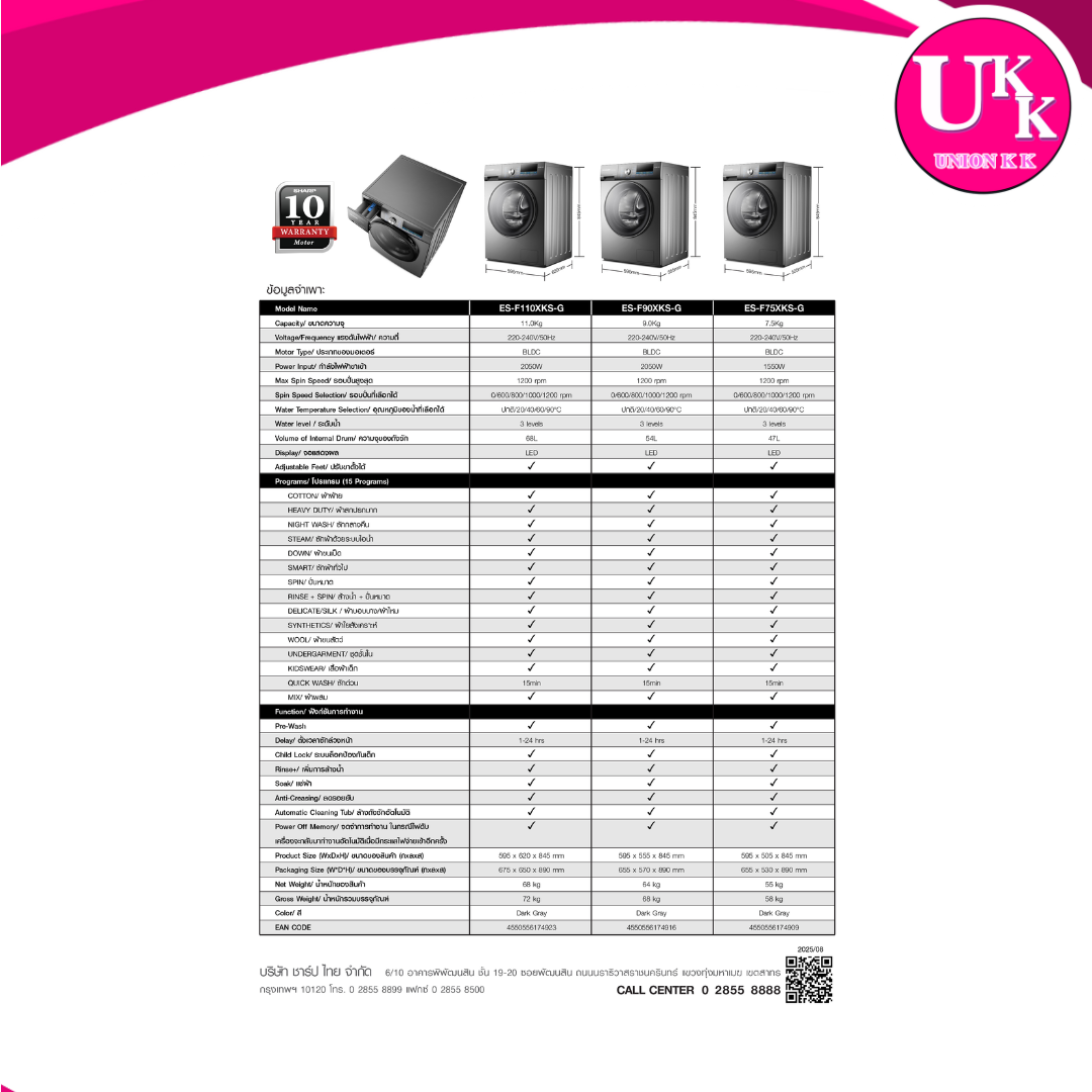 SHARP เครื่องซักผ้าฝาหน้า รุ่น ES-F90XKS-G ขนาด 9 กก. สีเทาเข้ม Inverter