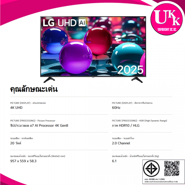 น้ำหนักทีวีแบบไม่รวมขาตั้ง (Kg) 6.1