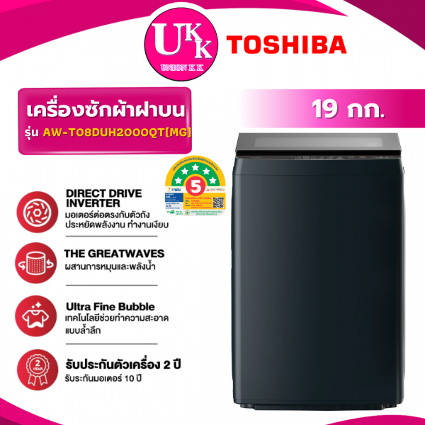 TOSHIBA เครื่องซักผ้าฝาบน รุ่น AW-T08DUH2000QT(MG) 19 กก. Direct Drive Inverter