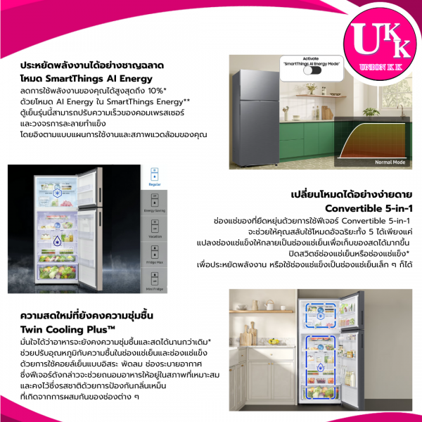 เพลิดเพลินไปกับช่องแช่ของที่ยืดหยุ่น ด้วยการใช้เทคโนโลยี Twin Cooling Plus™ ฟีเจอร์ Convertible 5-in-1 จะช่วยให้คุณสลับใช้โหมดอัจฉริยะทั้ง 5 ได้ เพียงแค่แปลงช่องแช่แข็งให้กลายเป็นช่องแช่เย็นเพื่อเก็บของสดให้ได้มากขึ้น ปิดสวิตช์ช่องแช่เย็นหรือช่องแช่แข็ง* เพื่อประหยัดพลังงาน หรือใช้ช่องแช่แข็งเป็นช่องแช่เย็นเล็ก ๆ ก็ได้