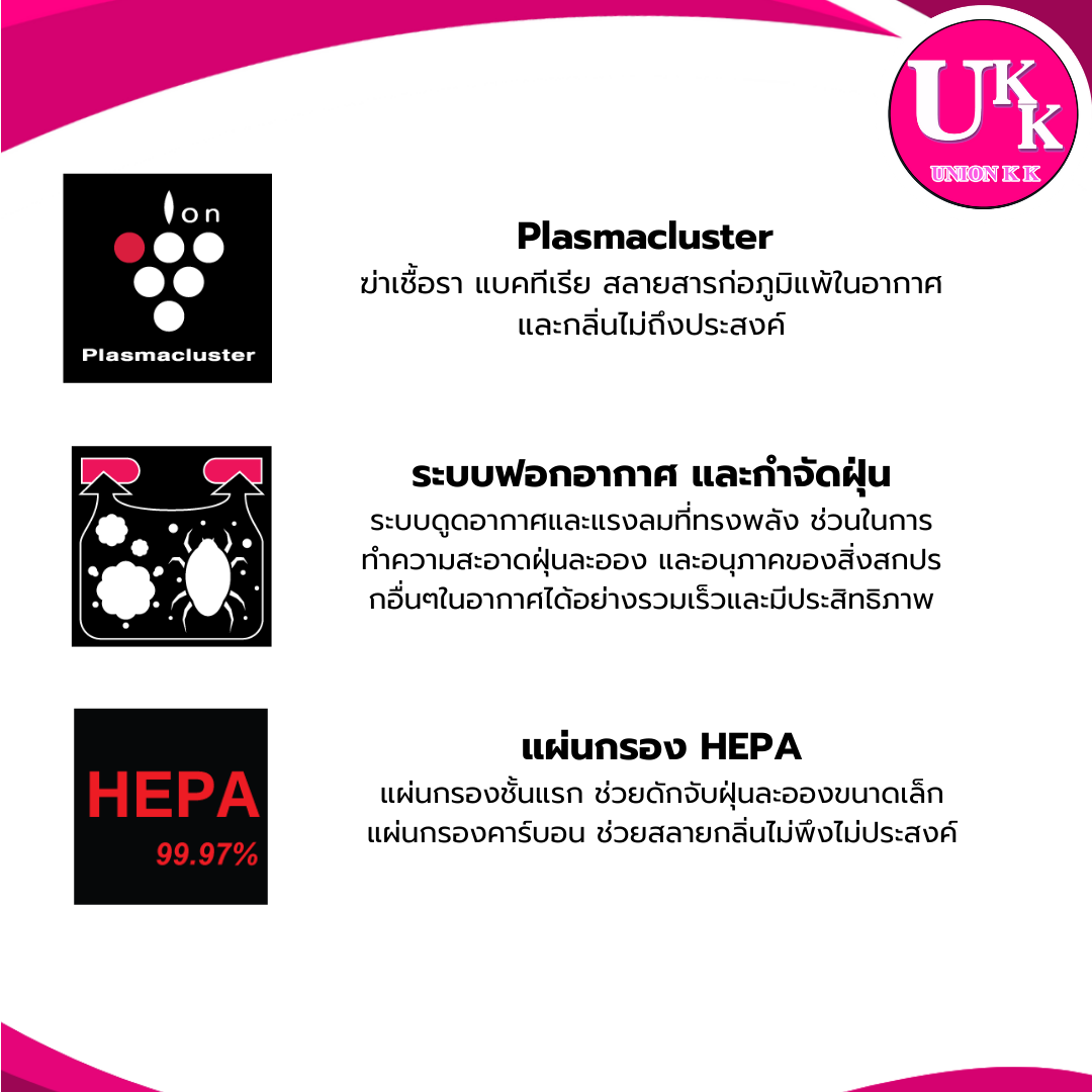 • ระบบทำงานแบบ ION SHOWER ช่วยเพิ่มประสิทธิภาพการทำงานของระบบพลาสม่าคลัสเตอร์ ด้วยการพ่นอนุภาคไฟฟ้าบวก และลบ ที่มีความเข้มข้นสูงสุด และลมแรงสุด เป็นเวลาประมาณ 60 นาที ทำให้ห้องสะอาดปราศจาก เชื้อโรคต่างๆ อย่างรวดเร็ว